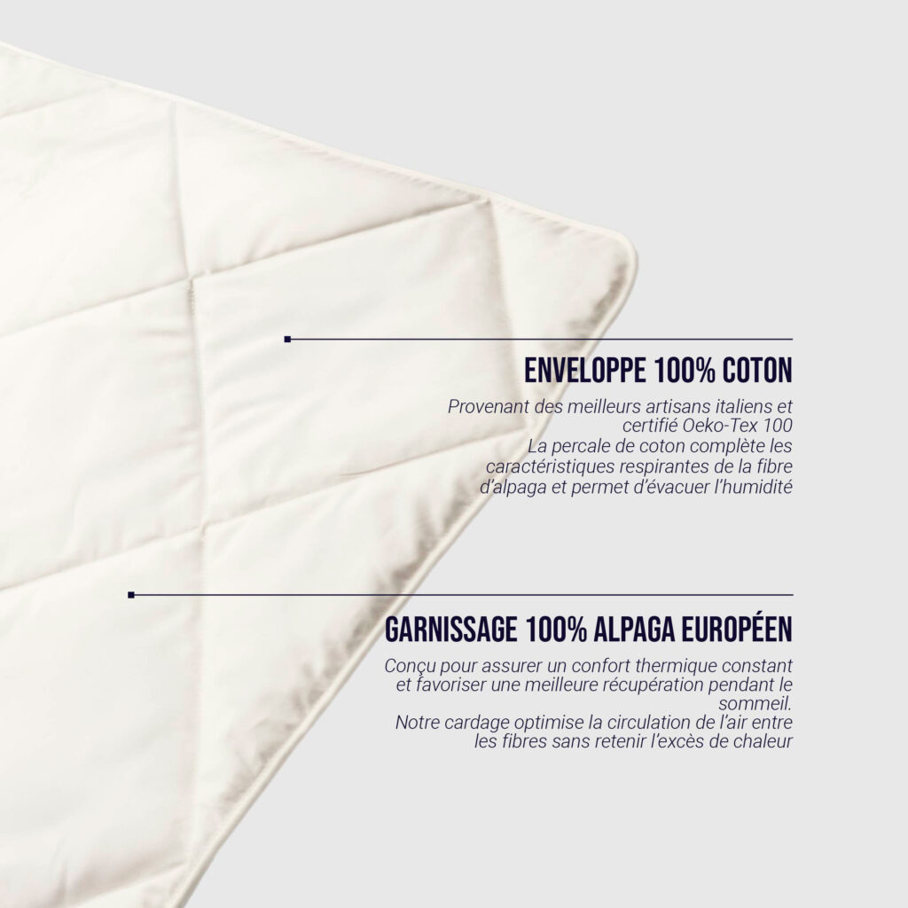 - Thermorégulatrice, respirante, hypoallergénique et naturelle.